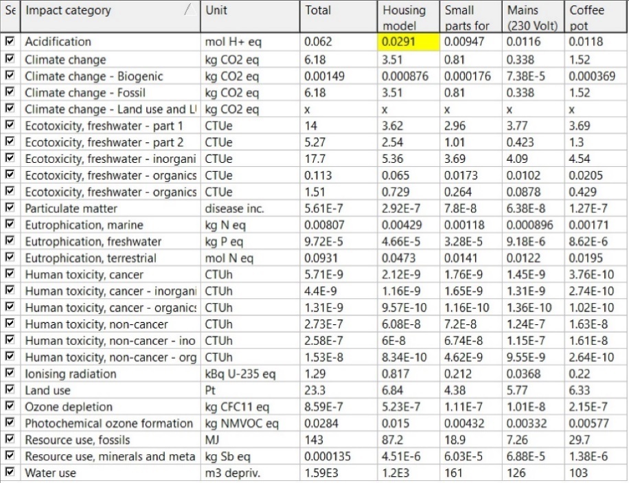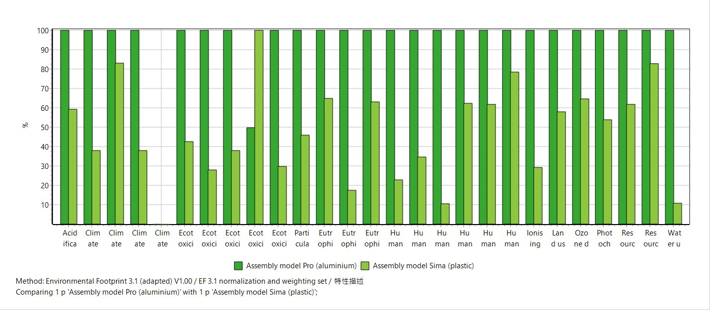 含碳足跡(IPCC 2021)、環境足跡(EF3.1,內含地球暖化、臭氧層、酸化、優養化、光化學氧化、水足跡等環境衝擊指標)及其他共數十種環境衝擊評估方法與指標。